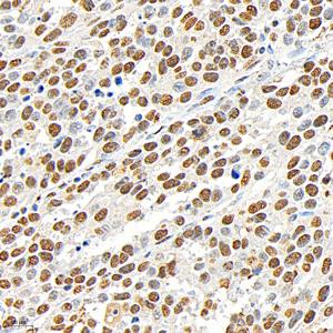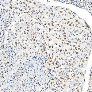 | IHC检测Phospho-p38 (T180/Y182)蛋白(货号 GB153380). 样品: 人宫颈癌, 4%多聚甲醛 (货号G1101) 固定12-24小时. 抗原修复: 柠檬酸抗原修复液(干粉, pH 6.0) (G1201), 高压锅均匀喷气计时2分钟. —抗: 1: 500稀释, 4℃ 孵育过夜. 二抗: HRP标记山羊抗兔IgG (H+L) (货号GB23303), 1: 200稀释, 室温孵育1小时. |