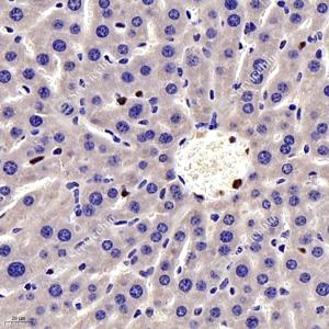 IHC检测IL-17蛋白(货号 GB11110-1). 样品: 小鼠肝, 4%多聚甲醛 (货号G1101) 固定12-24小时. 抗原修复: 柠檬酸抗原修复液(干粉, pH 6.0) (G1201), 98℃, 20分钟. —抗: 1: 700稀释, 4℃ 孵育过夜. 二抗: HRP标记山羊抗兔IgG (H+L) (货号GB23303), 1: 200稀释, 室温孵育1小时. |
