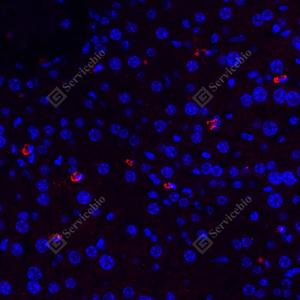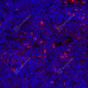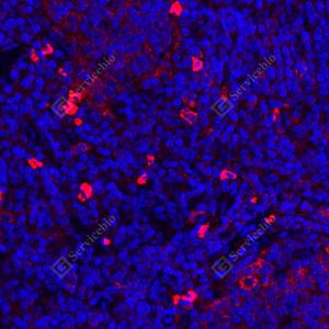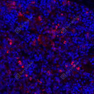 IF检测IL-17蛋白(货号 GB11110-1)(红色). 样品: 小鼠脂多糖诱导炎症模型(6h)脾脏, 4%多聚甲醛 (货号G1101) 固定12-24小时. 抗原修复: Tris-EDTA抗原修复液(pH 9.0) (G1203), 98℃, 20分钟. 封闭: 3% BSA(货号GC305010)的PBS溶液, 室温孵育30分钟. —抗: 1: 500稀释, 4℃ 孵育过夜. 二抗: Cy3标记山羊抗兔IgG (H+L) (货号GB21303), 1: 300稀释, 室温孵育1小时. |