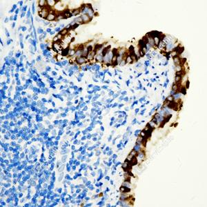 IHC检测Hsp90蛋白(货号 GB15284). 样品: 小鼠肺, 4%多聚甲醛 (货号G1101) 固定12-24小时. 抗原修复: 柠檬酸抗原修复液(干粉, pH 6.0) (G1201), 高压锅均匀喷气计时2分钟. —抗: 1: 4000稀释, 4℃ 孵育过夜. 二抗: S-vision免疫组化多聚二抗(山羊抗小鼠), 即用型(货号G1301), 室温孵育20分钟. |