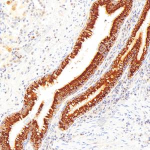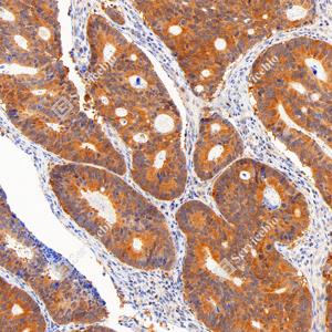 | IHC检测Hsp90蛋白(货号 GB150037). 样品: 人结肠癌, 4%多聚甲醛 (货号G1101) 固定12-24小时. 抗原修复: Tris-EDTA抗原修复液(pH 9.0) (G1203), 98℃, 20分钟. —抗: 1: 1000稀释, 4℃ 孵育过夜. 二抗: S-vision免疫组化多聚二抗(山羊抗兔),即用型 (货号G1302), 室温孵育20分钟. |