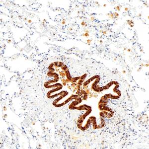 | IHC检测Hsp90蛋白(货号 GB150037). 样品: 人肺癌, 4%多聚甲醛 (货号G1101) 固定12-24小时. 抗原修复: Tris-EDTA抗原修复液(pH 9.0) (G1203), 98℃, 20分钟. —抗: 1: 1000稀释, 4℃ 孵育过夜. 二抗: S-vision免疫组化多聚二抗(山羊抗兔),即用型 (货号G1302), 室温孵育20分钟. |