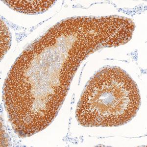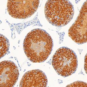 | IHC检测Hsp90蛋白(货号 GB150037). 样品: 小鼠睾丸, 4%多聚甲醛 (货号G1101) 固定12-24小时. 抗原修复: Tris-EDTA抗原修复液(pH 9.0) (G1203), 98℃, 20分钟. —抗: 1: 1000稀释, 4℃ 孵育过夜. 二抗: S-vision免疫组化多聚二抗(山羊抗兔),即用型 (货号G1302), 室温孵育20分钟. |