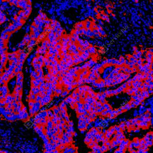 | IF检测Hsp90蛋白(货号 GB150037)(红色). 样品: 人结肠癌, 4%多聚甲醛 (货号G1101) 固定12-24小时. 抗原修复: Tris-EDTA抗原修复液(pH 9.0) (G1203), 98℃, 20分钟. 封闭: 3% BSA(货号GC305010)的PBS溶液, 室温孵育30分钟. —抗: 1: 1000稀释, 4℃ 孵育过夜. 二抗: Cy3标记山羊抗兔IgG (H+L) (货号GB21303), 1: 300稀释, 室温孵育1小时. |