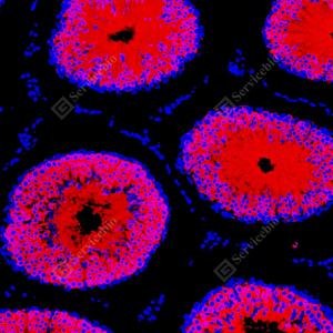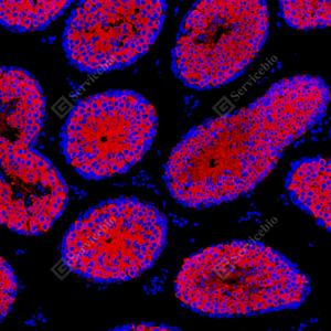 | IF检测Hsp90蛋白(货号 GB150037)(红色). 样品: 大鼠睾丸, 4%多聚甲醛 (货号G1101) 固定12-24小时. 抗原修复: Tris-EDTA抗原修复液(pH 9.0) (G1203), 98℃, 20分钟. 封闭: 3% BSA(货号GC305010)的PBS溶液, 室温孵育30分钟. —抗: 1: 1000稀释, 4℃ 孵育过夜. 二抗: Cy3标记山羊抗兔IgG (H+L) (货号GB21303), 1: 300稀释, 室温孵育1小时. |