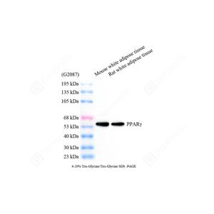 | WB检测PPAR gamma蛋白(货号 GB152205). 样品: 经RIPA裂解液(货号G2002)处理的蛋白质. 封闭: 3%脱脂牛奶(货号GC310001)溶于TBST溶液, 室温孵育1小时. —抗: 1: 1000稀释, 4℃ 孵育过夜. 二抗: HRP标记山羊抗兔IgG (H+L) (货号GB23303), 1: 5000稀释, 室温孵育1小时. |