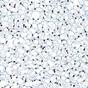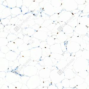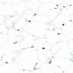| IHC检测PPAR gamma蛋白(货号 GB152205). 样品: 小鼠白色脂肪, 4%多聚甲醛 (货号G1101) 固定12-24小时. 抗原修复: Tris-EDTA抗原修复液(pH 9.0) (G1203), 100℃, 25分钟. —抗: 1: 5000稀释, 4℃ 孵育过夜. 二抗: S-vision免疫组化多聚二抗(山羊抗兔),即用型 (货号G1302), 室温孵育20分钟. |