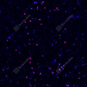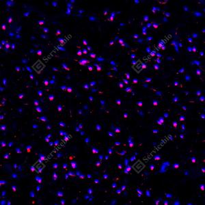 | IF检测PPAR gamma蛋白(货号 GB152205)(红色). 样品: 大鼠白色脂肪, 4%多聚甲醛 (货号G1101) 固定12-24小时. 抗原修复: Tris-EDTA抗原修复液(pH 9.0) (G1203), 100℃, 25分钟. 封闭: 3% BSA(货号GC305010)的PBS溶液, 室温孵育30分钟. —抗: 1: 5000稀释, 4℃ 孵育过夜. 二抗: Cy3标记山羊抗兔IgG (H+L) (货号GB21303), 1: 300稀释, 室温孵育1小时. |