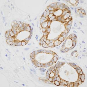 IHC检测Cytokeratin 19蛋白(货号 GB15198). 样品: 人乳腺癌, 4%多聚甲醛 (货号G1101) 固定12-24小时. 抗原修复: 柠檬酸抗原修复液(干粉, pH 6.0) (G1201), 高压锅均匀喷气计时2分钟. —抗: 1: 1000稀释, 4℃ 孵育过夜. 二抗: HRP标记山羊抗小鼠IgG (H+L) (货号GB23301), 1: 200稀释, 室温孵育1小时. |