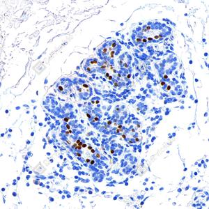 IHC检测Estrogen Receptor alpha蛋白(货号 GB151844). 样品: 人乳腺, 4%多聚甲醛 (货号G1101) 固定12-24小时. 抗原修复: Tris-EDTA抗原修复液(pH 9.0) (G1203), 100℃, 20分钟. —抗: 1: 200稀释, 4℃ 孵育过夜. 二抗: S-vision免疫组化多聚二抗(山羊抗兔),即用型 (货号G1302), 室温孵育20分钟. |