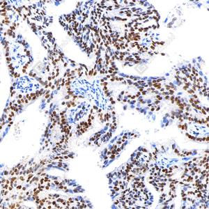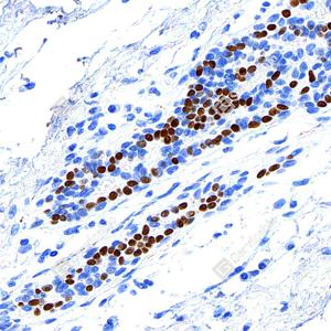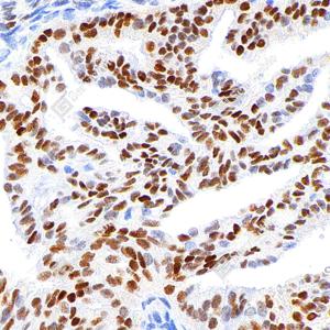IHC检测Estrogen Receptor alpha蛋白(货号 GB151844). 样品: 人子宫内膜癌, 4%多聚甲醛 (货号G1101) 固定12-24小时. 抗原修复: Tris-EDTA抗原修复液(pH 9.0) (G1203), 100℃, 20分钟. —抗: 1: 200稀释, 4℃ 孵育过夜. 二抗: S-vision免疫组化多聚二抗(山羊抗兔),即用型 (货号G1302), 室温孵育20分钟. |