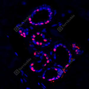 IF检测Estrogen Receptor alpha蛋白(货号 GB151844)(红色). 样品: 人乳腺, 4%多聚甲醛 (货号G1101) 固定12-24小时. 抗原修复: 柠檬酸抗原修复液(干粉, pH 6.0) (G1201), 高压锅均匀喷气计时2分钟. 封闭: 3% BSA(货号GC305010)的PBS溶液, 室温孵育30分钟. —抗: 1: 200稀释, 4℃ 孵育过夜. 二抗: Cy3标记山羊抗兔IgG (H+L) (货号GB21303), 1: 300稀释, 室温孵育1小时. |