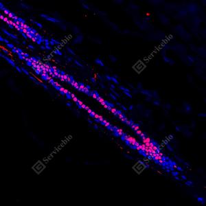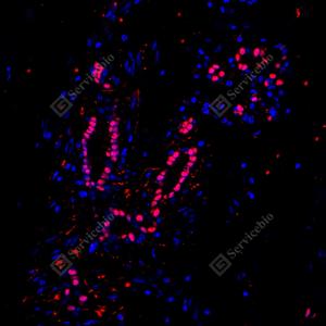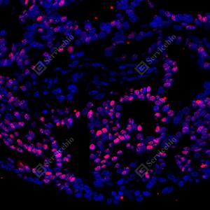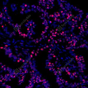 IF检测Estrogen Receptor alpha蛋白(货号 GB151844)(红色). 样品: 人子宫内膜癌, 4%多聚甲醛 (货号G1101) 固定12-24小时. 抗原修复: 柠檬酸抗原修复液(干粉, pH 6.0) (G1201), 高压锅均匀喷气计时2分钟. 封闭: 3% BSA(货号GC305010)的PBS溶液, 室温孵育30分钟. —抗: 1: 200稀释, 4℃ 孵育过夜. 二抗: Cy3标记山羊抗兔IgG (H+L) (货号GB21303), 1: 300稀释, 室温孵育1小时. |