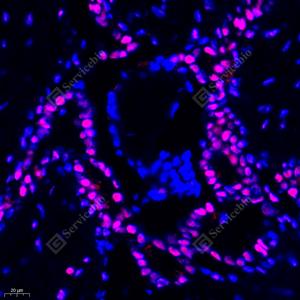 IF检测Estrogen Receptor alpha蛋白(货号 GB111843)(红色). 样品: 人乳腺癌, 4%多聚甲醛 (货号G1101) 固定12-24小时. 抗原修复: Tris-EDTA抗原修复液(pH 9.0) (G1203), 98℃, 20分钟. 封闭: 3% BSA(货号GC305010)的PBS溶液, 室温孵育30分钟. —抗: 1: 800稀释, 4℃ 孵育过夜. 二抗: Cy3标记山羊抗兔IgG (H+L) (货号GB21303), 1: 300稀释, 室温孵育1小时. |