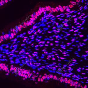 IF检测Estrogen Receptor alpha蛋白(货号 GB111843)(红色). 样品: 大鼠子宫, 4%多聚甲醛 (货号G1101) 固定12-24小时. 抗原修复: Tris-EDTA抗原修复液(pH 9.0) (G1203), 98℃, 20分钟. 封闭: 3% BSA(货号GC305010)的PBS溶液, 室温孵育30分钟. —抗: 1: 800稀释, 4℃ 孵育过夜. 二抗: Cy3标记山羊抗兔IgG (H+L) (货号GB21303), 1: 300稀释, 室温孵育1小时. |