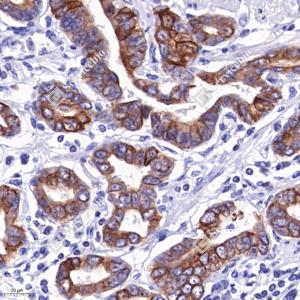 IHC检测Cytokeratin 19蛋白(货号 GB12198). 样品: 人胃癌, 4%多聚甲醛 (货号G1101) 固定12-24小时. 抗原修复: 柠檬酸抗原修复液(干粉, pH 6.0) (G1201), 高压锅均匀喷气计时2分钟. —抗: 1: 1000稀释, 4℃ 孵育过夜. 二抗: HRP标记山羊抗小鼠IgG (H+L) (货号GB23301), 1: 200稀释, 室温孵育1小时. |