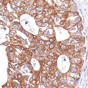 IHC检测Cytokeratin 19蛋白(货号 GB12198). 样品: 人乳腺癌, 4%多聚甲醛 (货号G1101) 固定12-24小时. 抗原修复: 柠檬酸抗原修复液(干粉, pH 6.0) (G1201), 高压锅均匀喷气计时2分钟. —抗: 1: 1000稀释, 4℃ 孵育过夜. 二抗: HRP标记山羊抗小鼠IgG (H+L) (货号GB23301), 1: 200稀释, 室温孵育1小时. |