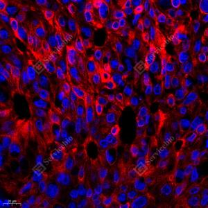 IF检测Cytokeratin 19蛋白(货号 GB12198)(红色). 样品: 人肺腺癌, 4%多聚甲醛 (货号G1101) 固定12-24小时. 抗原修复: 柠檬酸抗原修复液(干粉, pH 6.0) (G1201), 高压锅均匀喷气计时2分钟. 封闭: 3% BSA(货号GC305010)的PBS溶液, 室温孵育30分钟. —抗: 1: 500稀释, 4℃ 孵育过夜. 二抗: Cy3标记山羊抗小鼠IgG (H+L) (货号GB21301), 1: 300稀释, 室温孵育1小时. |