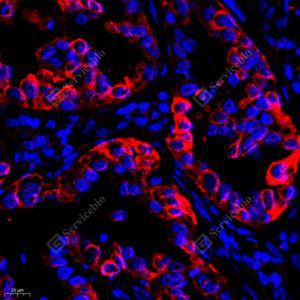 IF检测Cytokeratin 19蛋白(货号 GB12198)(红色). 样品: 人乳腺癌, 4%多聚甲醛 (货号G1101) 固定12-24小时. 抗原修复: 柠檬酸抗原修复液(干粉, pH 6.0) (G1201), 高压锅均匀喷气计时2分钟. 封闭: 3% BSA(货号GC305010)的PBS溶液, 室温孵育30分钟. —抗: 1: 1000稀释, 4℃ 孵育过夜. 二抗: Cy3标记山羊抗小鼠IgG (H+L) (货号GB21301), 1: 300稀释, 室温孵育1小时. |