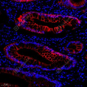 IF检测Cytokeratin 19蛋白(货号 GB12198)(红色). 样品: 人胃癌, 4%多聚甲醛 (货号G1101) 固定12-24小时. 抗原修复: 柠檬酸抗原修复液(干粉, pH 6.0) (G1201), 高压锅均匀喷气计时2分钟. 封闭: 3% BSA(货号GC305010)的PBS溶液, 室温孵育30分钟. —抗: 1: 500稀释, 4℃ 孵育过夜. 二抗: Cy3标记山羊抗小鼠IgG (H+L) (货号GB21301), 1: 300稀释, 室温孵育1小时. |