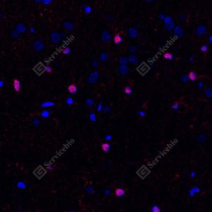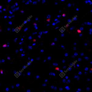 | IF检测S100 beta蛋白(货号 GB15359)(红色). 样品: 小鼠脑, 4%多聚甲醛 (货号G1101) 固定12-24小时. 抗原修复: Tris-EDTA抗原修复液(pH 9.0) (G1203), 98℃, 20分钟. 封闭: 3% BSA(货号GC305010)的PBS溶液, 室温孵育30分钟. —抗: 1: 500稀释, 4℃ 孵育过夜. 二抗: Cy3标记山羊抗小鼠IgG (H+L) (货号GB21301), 1: 300稀释, 室温孵育1小时. |