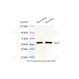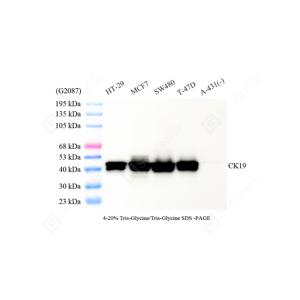 | WB检测Cytokeratin 19蛋白(货号 GB15197). 样品: 经RIPA裂解液(货号G2002)处理的蛋白质. 封闭: 3%脱脂牛奶(货号GC310001)溶于TBST溶液, 室温孵育1小时. —抗: 1: 1000稀释, 4℃ 孵育过夜. 二抗: HRP标记山羊抗兔IgG (H+L) (货号GB23303), 1: 5000稀释, 室温孵育1小时. |