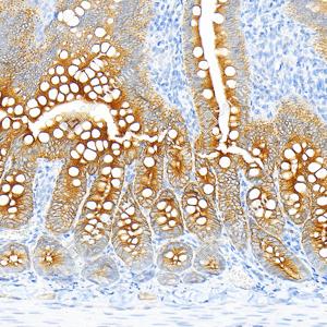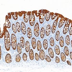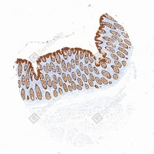 | IHC检测Cytokeratin 19蛋白(货号 GB15197). 样品: 小鼠结肠, 4%多聚甲醛 (货号G1101) 固定12-24小时. 抗原修复: Tris-EDTA抗原修复液(pH 9.0) (G1203), 100℃, 25分钟. —抗: 1: 300稀释, 4℃ 孵育过夜. 二抗: S-vision免疫组化多聚二抗(山羊抗兔),即用型 (货号G1302), 室温孵育20分钟. |