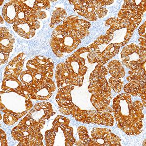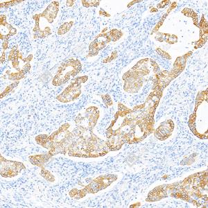 | IHC检测Cytokeratin 19蛋白(货号 GB15197). 样品: 人子宫内膜癌, 4%多聚甲醛 (货号G1101) 固定12-24小时. 抗原修复: Tris-EDTA抗原修复液(pH 9.0) (G1203), 100℃, 25分钟. —抗: 1: 450稀释, 4℃ 孵育过夜. 二抗: S-vision免疫组化多聚二抗(山羊抗兔),即用型 (货号G1302), 室温孵育20分钟. |