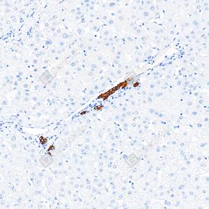 | IHC检测Cytokeratin 19蛋白(货号 GB15197). 样品: 大鼠肝, 4%多聚甲醛 (货号G1101) 固定12-24小时. 抗原修复: Tris-EDTA抗原修复液(pH 9.0) (G1203), 100℃, 25分钟. —抗: 1: 450稀释, 4℃ 孵育过夜. 二抗: S-vision免疫组化多聚二抗(山羊抗兔),即用型 (货号G1302), 室温孵育20分钟. |