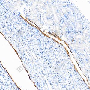 | IHC检测Cytokeratin 19蛋白(货号 GB15197). 样品: 小鼠肾, 4%多聚甲醛 (货号G1101) 固定12-24小时. 抗原修复: Tris-EDTA抗原修复液(pH 9.0) (G1203), 100℃, 25分钟. —抗: 1: 450稀释, 4℃ 孵育过夜. 二抗: S-vision免疫组化多聚二抗(山羊抗兔),即用型 (货号G1302), 室温孵育20分钟. |