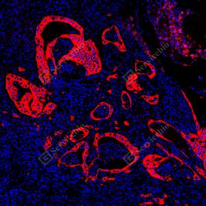 | IF检测Cytokeratin 19蛋白(货号 GB15197)(红色). 样品: 人结肠癌, 4%多聚甲醛 (货号G1101) 固定12-24小时. 抗原修复: Tris-EDTA抗原修复液(pH 9.0) (G1203), 100℃, 25分钟. 封闭: 3% BSA(货号GC305010)的PBS溶液, 室温孵育30分钟. —抗: 1: 500稀释, 4℃ 孵育过夜. 二抗: Cy3标记山羊抗兔IgG (H+L) (货号GB21303), 1: 300稀释, 室温孵育1小时. |