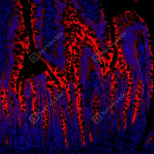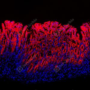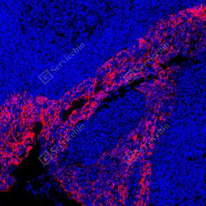 | IF检测Cytokeratin 19蛋白(货号 GB15197)(红色). 样品: 小鼠胃, 4%多聚甲醛 (货号G1101) 固定12-24小时. 抗原修复: Tris-EDTA抗原修复液(pH 9.0) (G1203), 100℃, 25分钟. 封闭: 3% BSA(货号GC305010)的PBS溶液, 室温孵育30分钟. —抗: 1: 500稀释, 4℃ 孵育过夜. 二抗: Cy3标记山羊抗兔IgG (H+L) (货号GB21303), 1: 300稀释, 室温孵育1小时. |