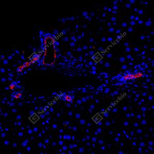 | IF检测Cytokeratin 19蛋白(货号 GB15197)(红色). 样品: 大鼠肝, 4%多聚甲醛 (货号G1101) 固定12-24小时. 抗原修复: Tris-EDTA抗原修复液(pH 9.0) (G1203), 100℃, 25分钟. 封闭: 3% BSA(货号GC305010)的PBS溶液, 室温孵育30分钟. —抗: 1: 500稀释, 4℃ 孵育过夜. 二抗: Cy3标记山羊抗兔IgG (H+L) (货号GB21303), 1: 300稀释, 室温孵育1小时. |