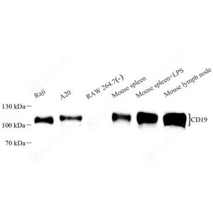 WB检测CD19蛋白(货号 GB11061-1). 样品: 经RIPA裂解液(货号G2002)处理的蛋白质. 封闭: 3%脱脂牛奶(货号GC310001)溶于TBST溶液, 室温孵育1小时. —抗: 1: 1000稀释, 4℃ 孵育过夜. 二抗: HRP标记山羊抗兔IgG (H+L) (货号GB23303), 1: 5000稀释, 室温孵育1小时. |