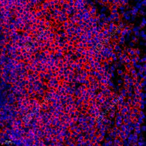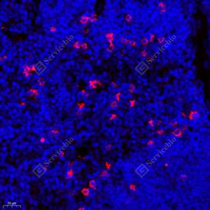 IF检测CD19蛋白(货号 GB11061-1)(红色). 样品: 小鼠脾, 4%多聚甲醛 (货号G1101) 固定12-24小时. 抗原修复: Tris-EDTA抗原修复液(pH 9.0) (G1203), 98℃, 20分钟. 封闭: 3% BSA(货号GC305010)的PBS溶液, 室温孵育30分钟. —抗: 1: 500稀释, 4℃ 孵育过夜. 二抗: Cy3标记山羊抗兔IgG (H+L) (货号GB21303), 1: 300稀释, 室温孵育1小时. |