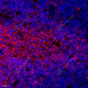 IF检测CD19蛋白(货号 GB11061-1)(红色). 样品: 小鼠胸腺, 4%多聚甲醛 (货号G1101) 固定12-24小时. 抗原修复: Tris-EDTA抗原修复液(pH 9.0) (G1203), 98℃, 20分钟. 封闭: 3% BSA(货号GC305010)的PBS溶液, 室温孵育30分钟. —抗: 1: 200稀释, 4℃ 孵育过夜. 二抗: Cy3标记山羊抗兔IgG (H+L) (货号GB21303), 1: 300稀释, 室温孵育1小时. |