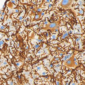 IHC检测MAP2蛋白(货号 GB115559). 样品: 人多形性胶质母细胞瘤, 4%多聚甲醛 (货号G1101) 固定12-24小时. 抗原修复: 柠檬酸抗原修复液(干粉, pH 6.0) (G1201), 98℃, 20分钟. —抗: 1: 1000稀释, 4℃ 孵育过夜. 二抗: HRP标记山羊抗兔IgG (H+L) (货号GB23303), 1: 200稀释, 室温孵育1小时. |
