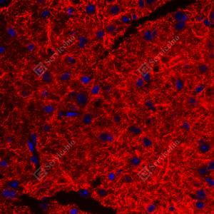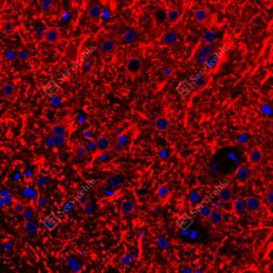 IF检测MAP2蛋白(货号 GB115559)(红色). 样品: 小鼠脑, 4%多聚甲醛 (货号G1101) 固定12-24小时. 抗原修复: Tris-EDTA抗原修复液(pH 9.0) (G1203), 98℃, 20分钟. 封闭: 3% BSA(货号GC305010)的PBS溶液, 室温孵育30分钟. —抗: 1: 500稀释, 4℃ 孵育过夜. 二抗: Cy3标记山羊抗兔IgG (H+L) (货号GB21303), 1: 300稀释, 室温孵育1小时. |