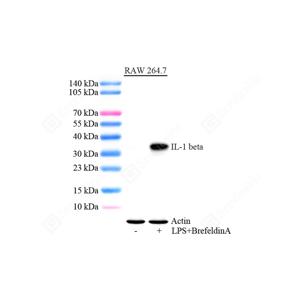 | WB检测IL-1 beta蛋白(货号 GB15113). 样品: 经RIPA裂解液(货号G2002)处理的蛋白质. 封闭: 3%脱脂牛奶(货号GC310001)溶于TBST溶液, 室温孵育1小时. —抗: 1: 1000稀释, 4℃ 孵育过夜. 二抗: HRP标记山羊抗兔IgG (H+L) (货号GB23303), 1: 5000稀释, 室温孵育1小时. |
