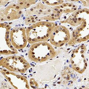 IHC检测CREB蛋白(货号 GB11236). 样品: 人肾, 4%多聚甲醛 (货号G1101) 固定12-24小时. 抗原修复: 柠檬酸抗原修复液(干粉, pH 6.0) (G1201), 98℃, 20分钟. —抗: 1: 400稀释, 4℃ 孵育过夜. 二抗: HRP标记山羊抗兔IgG (H+L) (货号GB23303), 1: 200稀释, 室温孵育1小时. |