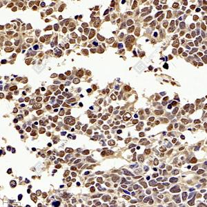 IHC检测CREB蛋白(货号 GB11236). 样品: 人胃癌, 4%多聚甲醛 (货号G1101) 固定12-24小时. 抗原修复: 柠檬酸抗原修复液(干粉, pH 6.0) (G1201), 98℃, 20分钟. —抗: 1: 1000稀释, 4℃ 孵育过夜. 二抗: HRP标记山羊抗兔IgG (H+L) (货号GB23303), 1: 200稀释, 室温孵育1小时. |