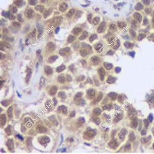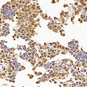 IHC检测CREB蛋白(货号 GB11236). 样品: 人肺癌, 4%多聚甲醛 (货号G1101) 固定12-24小时. 抗原修复: 柠檬酸抗原修复液(干粉, pH 6.0) (G1201), 98℃, 20分钟. —抗: 1: 400稀释, 4℃ 孵育过夜. 二抗: HRP标记山羊抗兔IgG (H+L) (货号GB23303), 1: 200稀释, 室温孵育1小时. |