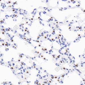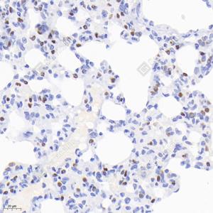 IHC检测TTF1(Thyroid transcription factor 1)蛋白(货号 GB122168). 样品: 小鼠肺, 4%多聚甲醛 (货号G1101) 固定12-24小时. 抗原修复: 柠檬酸抗原修复液(干粉, pH 6.0) (G1201), 高压锅均匀喷气计时2分钟. —抗: 1: 500稀释, 4℃ 孵育过夜. 二抗: HRP标记山羊抗小鼠IgG (H+L) (货号GB23301), 1: 200稀释, 室温孵育1小时. |