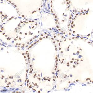 IHC检测TTF1(Thyroid transcription factor 1)蛋白(货号 GB122168). 样品: 大鼠甲状腺, 4%多聚甲醛 (货号G1101) 固定12-24小时. 抗原修复: 柠檬酸抗原修复液(干粉, pH 6.0) (G1201), 高压锅均匀喷气计时2分钟. —抗: 1: 1000稀释, 4℃ 孵育过夜. 二抗: HRP标记山羊抗小鼠IgG (H+L) (货号GB23301), 1: 200稀释, 室温孵育1小时. |