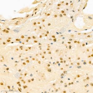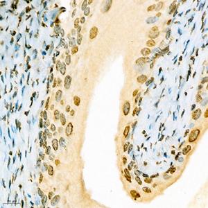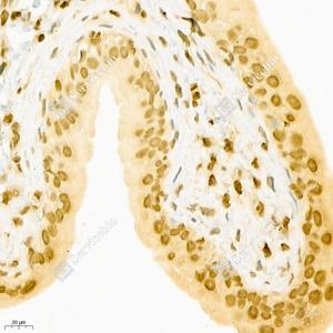 | IHC检测HES1蛋白(货号 GB112254). 样品: 小鼠膀胱, 4%多聚甲醛 (货号G1101) 固定12-24小时. 抗原修复: 柠檬酸抗原修复液(干粉, pH 6.0) (G1201), 98℃, 20分钟. —抗: 1: 1000稀释, 4℃ 孵育过夜. 二抗: HRP标记山羊抗兔IgG (H+L) (货号GB23303), 1: 200稀释, 室温孵育1小时. |