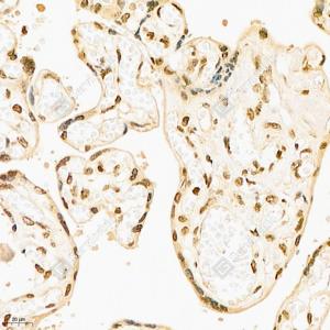 | IHC检测HES1蛋白(货号 GB112254). 样品: 人胎盘, 4%多聚甲醛 (货号G1101) 固定12-24小时. 抗原修复: 柠檬酸抗原修复液(干粉, pH 6.0) (G1201), 98℃, 20分钟. —抗: 1: 1000稀释, 4℃ 孵育过夜. 二抗: HRP标记山羊抗兔IgG (H+L) (货号GB23303), 1: 200稀释, 室温孵育1小时. |