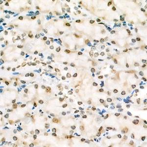 | IHC检测HES1蛋白(货号 GB112254). 样品: 大鼠肾, 4%多聚甲醛 (货号G1101) 固定12-24小时. 抗原修复: 柠檬酸抗原修复液(干粉, pH 6.0) (G1201), 98℃, 20分钟. —抗: 1: 1000稀释, 4℃ 孵育过夜. 二抗: HRP标记山羊抗兔IgG (H+L) (货号GB23303), 1: 200稀释, 室温孵育1小时. |
