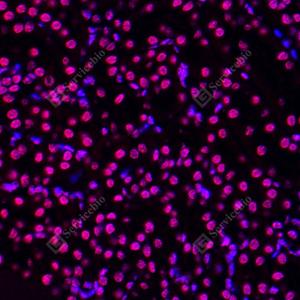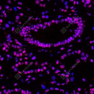 | IF检测HES1蛋白(货号 GB112254)(红色). 样品: 人肾, 4%多聚甲醛 (货号G1101) 固定12-24小时. 抗原修复: Tris-EDTA抗原修复液(pH 9.0) (G1203), 98℃, 20分钟. 封闭: 3% BSA(货号GC305010)的PBS溶液, 室温孵育30分钟. —抗: 1: 1000稀释, 4℃ 孵育过夜. 二抗: Cy3标记山羊抗兔IgG (H+L) (货号GB21303), 1: 300稀释, 室温孵育1小时. |
