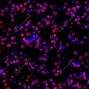 | IF检测HES1蛋白(货号 GB112254)(红色). 样品: 大鼠肾, 4%多聚甲醛 (货号G1101) 固定12-24小时. 抗原修复: Tris-EDTA抗原修复液(pH 9.0) (G1203), 98℃, 20分钟. 封闭: 3% BSA(货号GC305010)的PBS溶液, 室温孵育30分钟. —抗: 1: 1000稀释, 4℃ 孵育过夜. 二抗: Cy3标记山羊抗兔IgG (H+L) (货号GB21303), 1: 300稀释, 室温孵育1小时. |