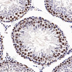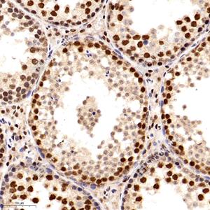 IHC检测BRG1蛋白(货号 GB11258). 样品: 小鼠睾丸, 4%多聚甲醛 (货号G1101) 固定12-24小时. 抗原修复: 柠檬酸抗原修复液(干粉, pH 6.0) (G1201), 98℃, 20分钟. —抗: 1: 200稀释, 4℃ 孵育过夜. 二抗: HRP标记山羊抗兔IgG (H+L) (货号GB23303), 1: 200稀释, 室温孵育1小时. |
